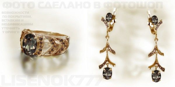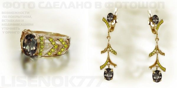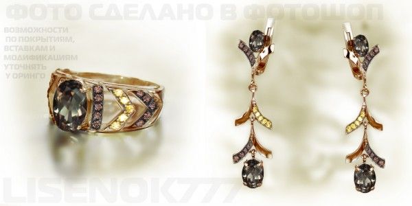 серьги павлин, верхний и нижний овалы - дымчатый кварц на черном родии, возле них циркончики - розовые, а средные - кофейные на черном родии, остальное - позолота (может, еще черного родия добавить где-то - для баланса). И еще вариант - просто с кофейными циркониями на черном родии, овальчики - тоже на черном родии, остальное - позолота, а на среднем листочке цирконий - золотистый. И к ним - колечко лаура (тоже с кварцем на черном, потом розовые циркончики на позолоте, дальше - кофейные на черном, и дальше - опять розовые на черном, если от центра смотреть; и второй вариант - золотистые, кофейные и опять золотистые циркончики).