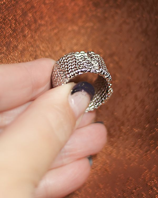 Мой покрыт родием. Уютное и удобное кольцо. Под перчатки - идеально.