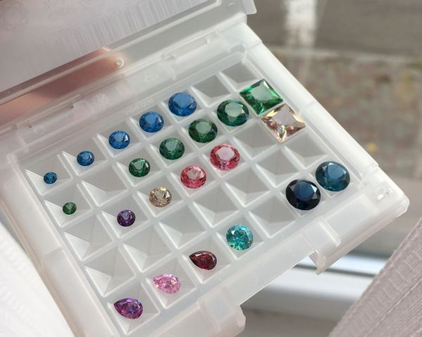 Ряд четвертый:  груши 4*6 Fancy Purple Zirconia, Pink Zirconia, Red Dark Zirconia; Mint Zirconia круг 6 и nano-London круг 8 (тёмный и светлый)