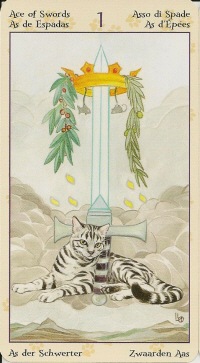 9. Туз Мечей. Кажется, этот кот - настоящий победитель! Бескомпромиссный взгляд, меч, легко удерживаемый лапами, а на короне - присмотритесь - парочка мышек для героя! Что ж, мышиного урожая гарантировать не могу, а вот новую идею, озарение, прилив вдохновения, развитие, переход на новую ступень - вполне! Сейчас самое благоприятное время для рывка, для того, чтобы одним усилием воли переломить ситуацию в свою пользу. Действуйте, отбросив сомнения и размышления, руководствуйтесь не эмоциями, а логикой - и удача будет на вашей стороне!