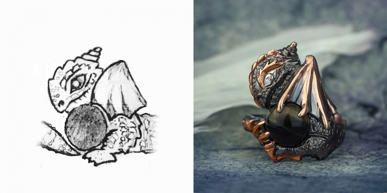Маленький страж згорнувся клубком навколо великого самоцвіту і пильно спостерігає за всіма блискучими очима: чи не зазіхне хто на його дорогоцінність? Детальніше про прикрасу можна прочитати у статті