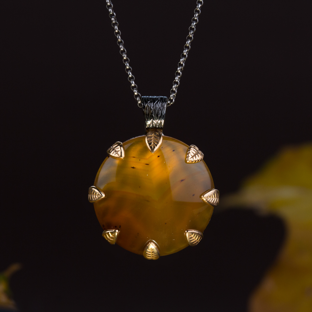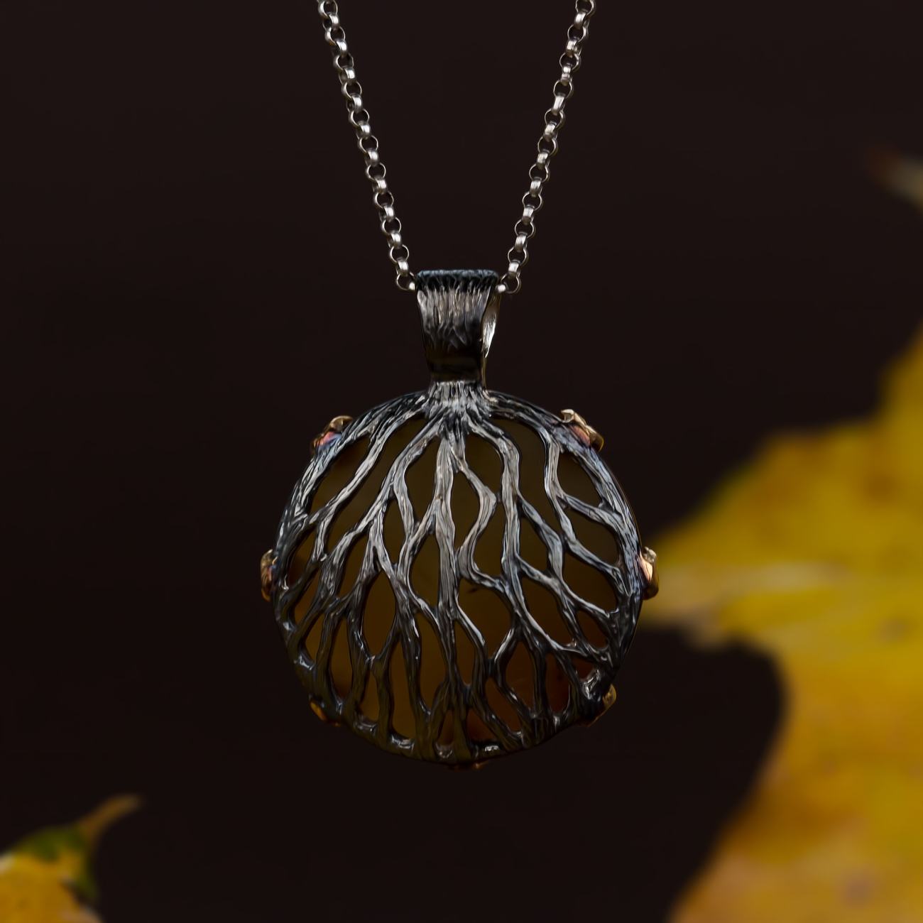 Ось він, прадавній ліс, в якому росла й росте наша надія: срібні гілочки дбайливо обіймають-оплетають чималий кабошон.Тільки подивіться, як щільно оплели вони підвіс, майже заховавши камінець з однієї сторони. Але з другої краса каменю нічим не захована: її підтримують та підкреслюють крапани-листочки, на яких детально промальована кожна прожилка. Малюнок каменю та дерева, таке просте і водночас вишукане поєднання, робить прикраси майже ексклюзивними.