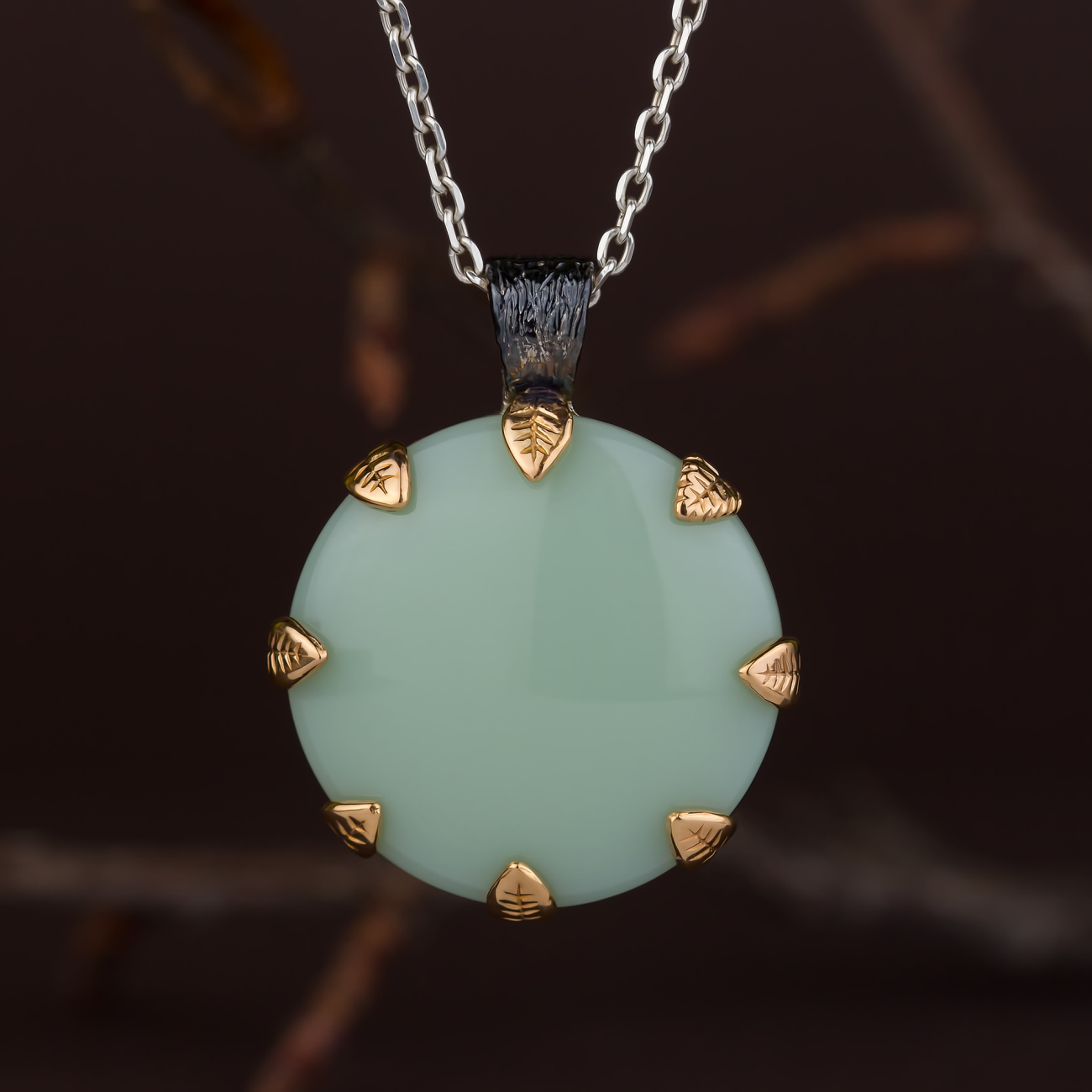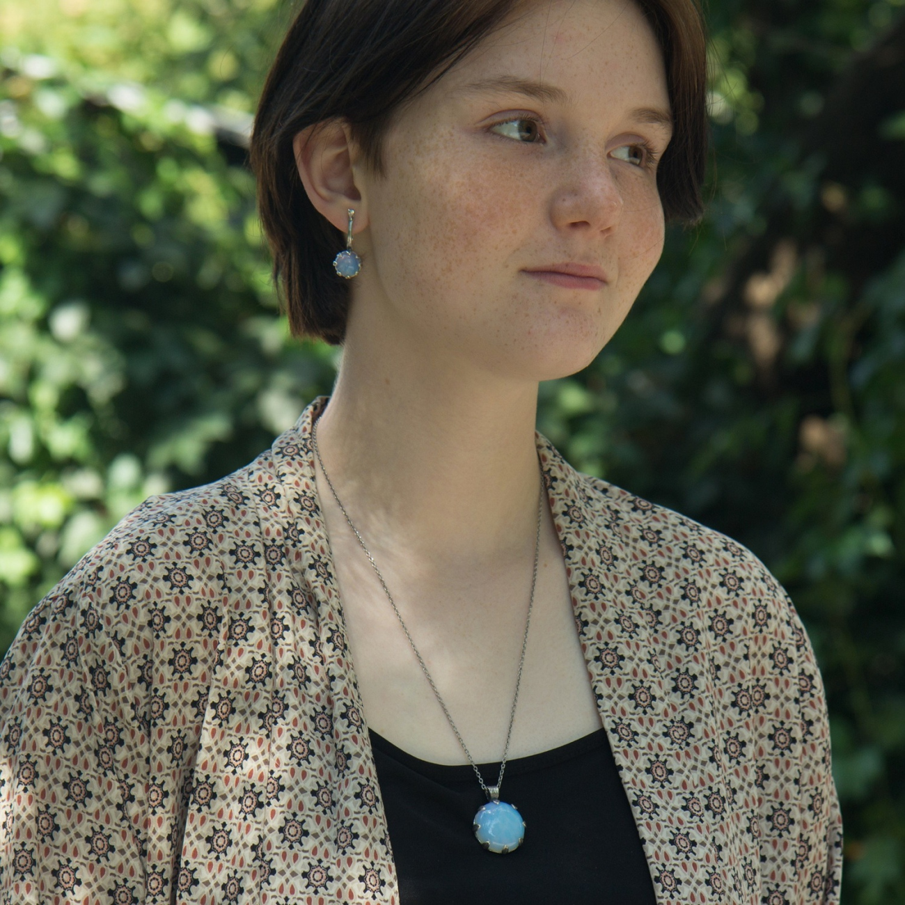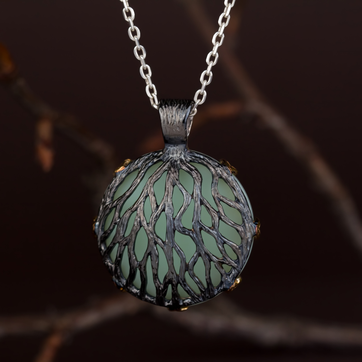 Ось він, прадавній ліс, в якому росла й росте наша надія: срібні гілочки дбайливо обіймають-оплетають чималий кабошон.Тільки подивіться, як щільно оплели вони підвіс, майже заховавши камінець з однієї сторони. Але з другої краса каменю нічим не захована: її підтримують та підкреслюють крапани-листочки, на яких детально промальована кожна прожилка. Малюнок каменю та дерева, таке просте і водночас вишукане поєднання, робить прикраси майже ексклюзивними.