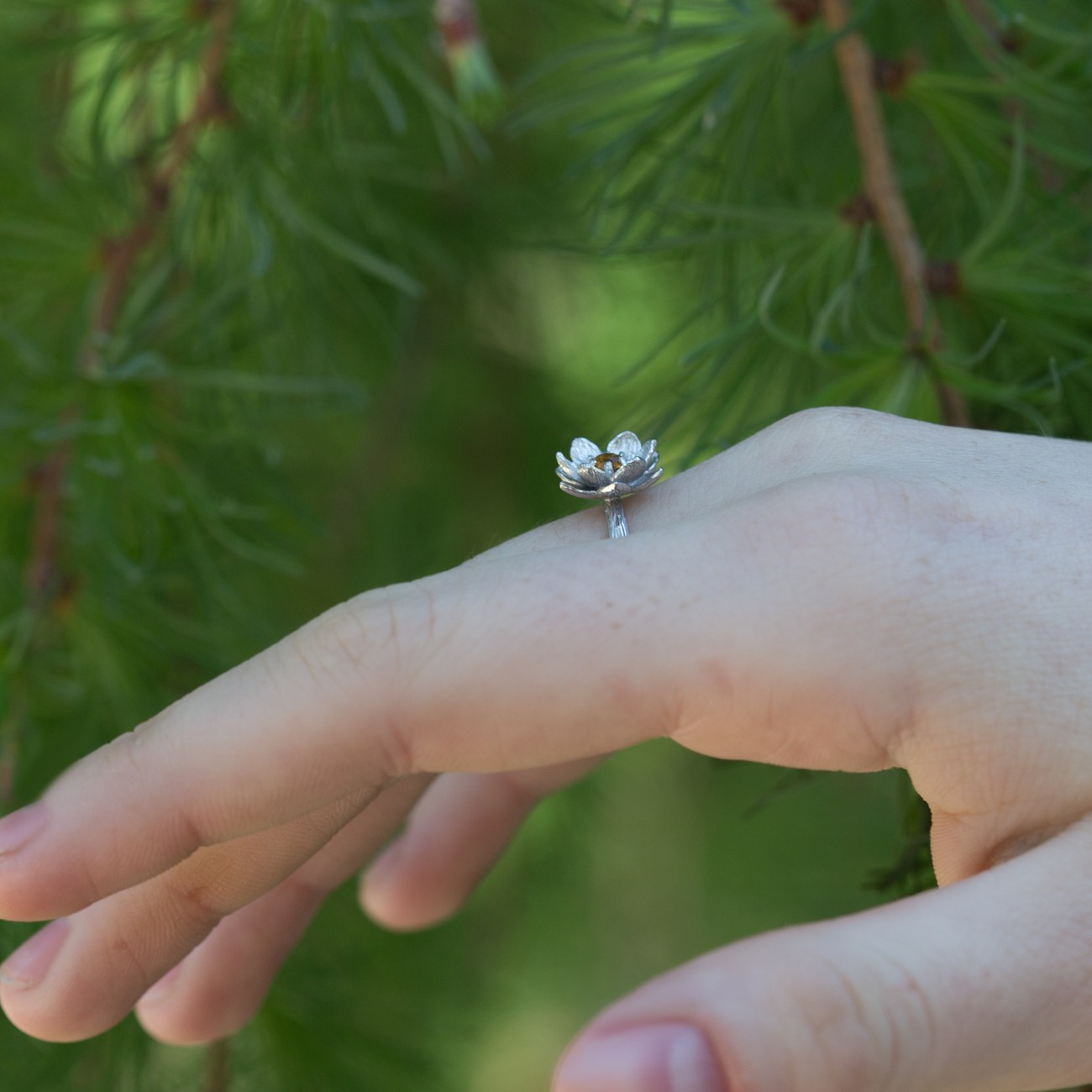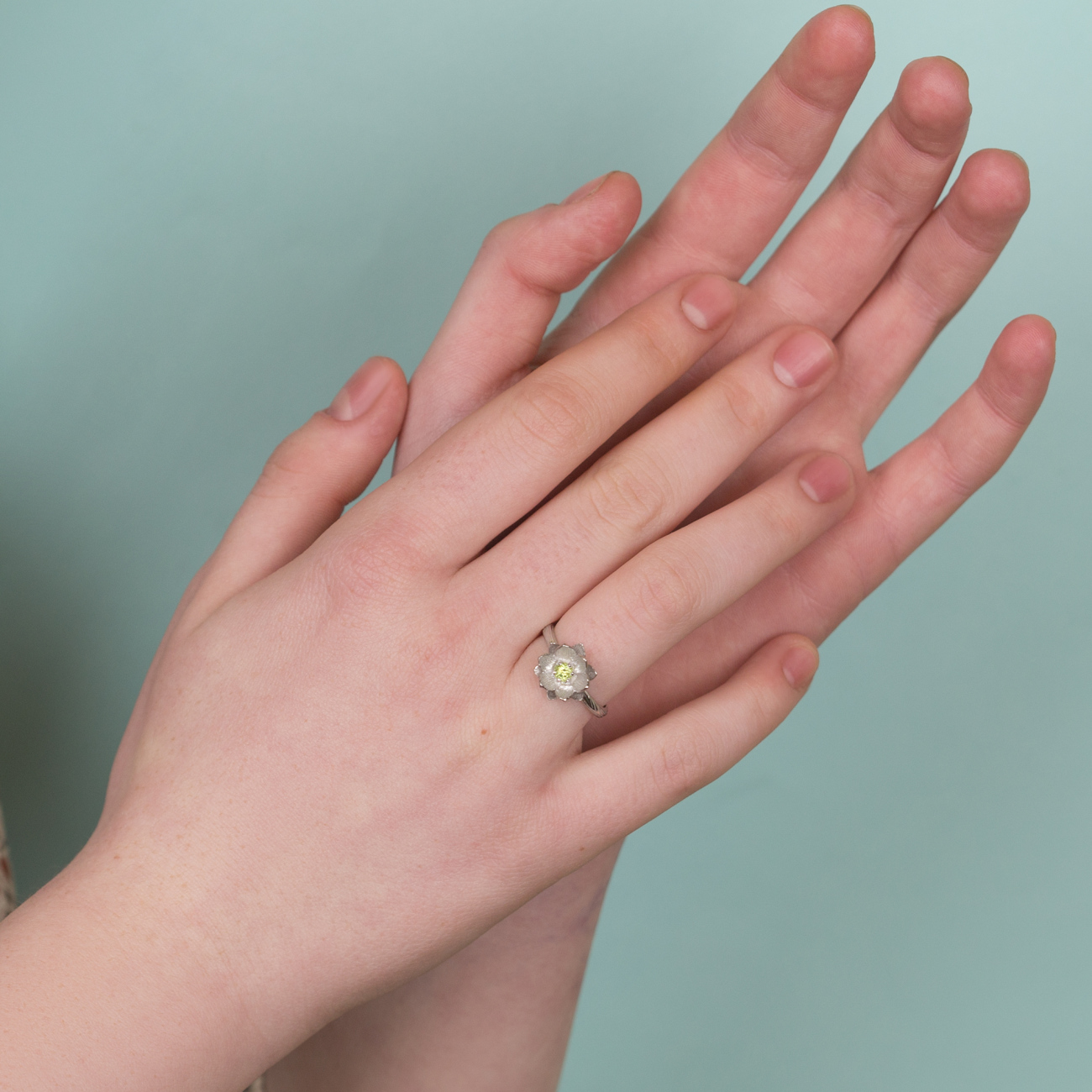 Габаритні розміри каблучки: діаметр квітки – 11 мм; висота над пальцем – 6 мм.