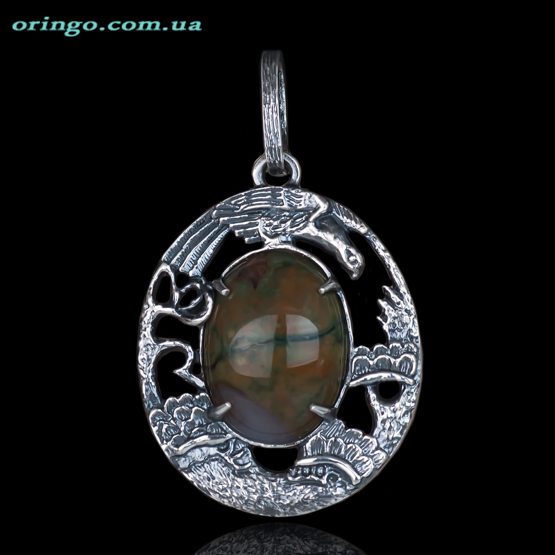 Яструб на прикрасі зображений спокійним і зосередженим; він сидить на характерно зігнутій сосновій гілці й уважно спостерігає за світом внизу. Яструб на сосні – частий мотив у японському живописі; птах символізує хоробрість і благородство, сосна – стійкість і витримку.