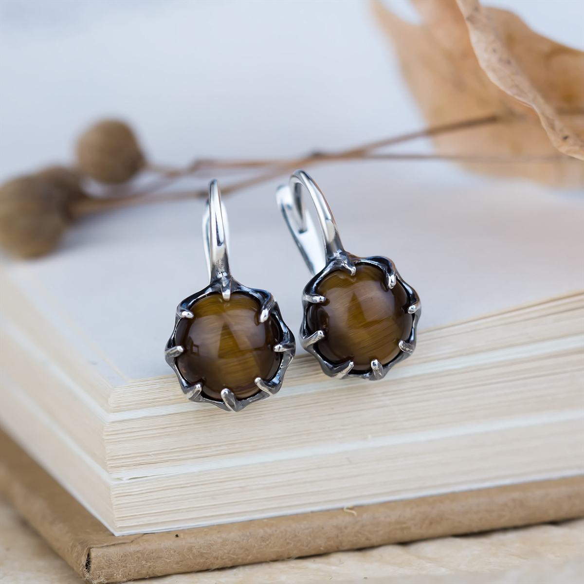 Эти серьги можно изготовить с такими кабошонами: амазонит, бирюза, соколиный глаз, змеевик, лабрадор, нефрит, родонит, сапфирин, сердолик, чароит, полосатая яшма.