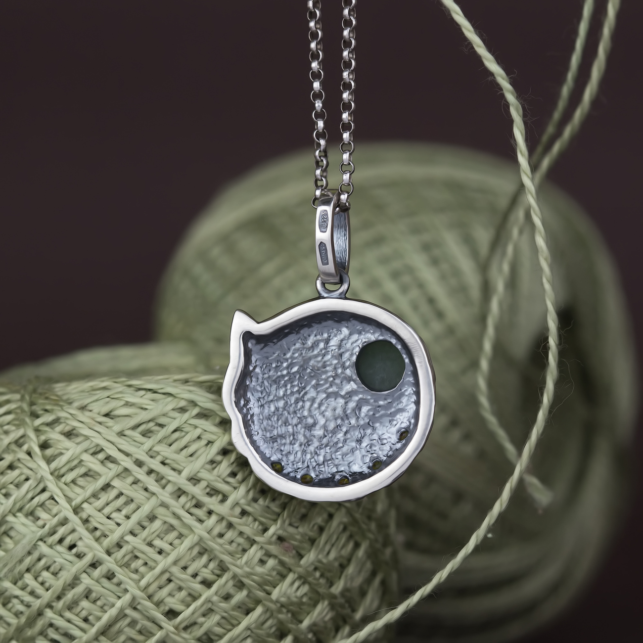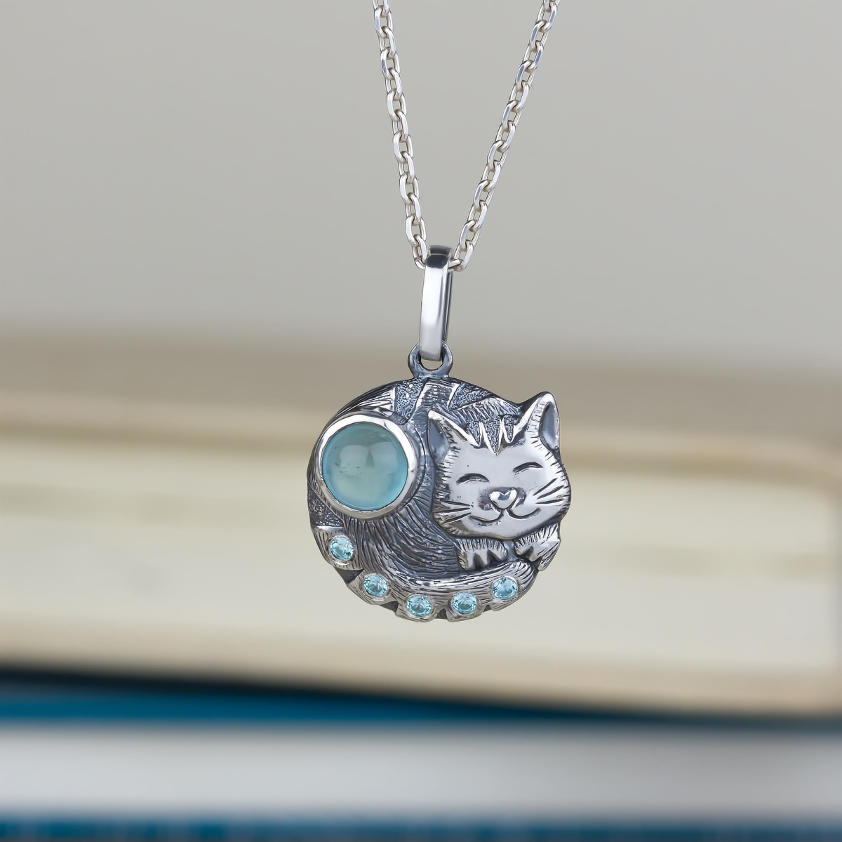 Задоволений і практично ідеально круглий кіт ніби обвивається довкола кабошона. Хвіст пухнастого красеня щедро посипаний маленькими блискучими цирконіями. Одного погляду на цього мурлику достатньо, щоб у серці запанував затишок!