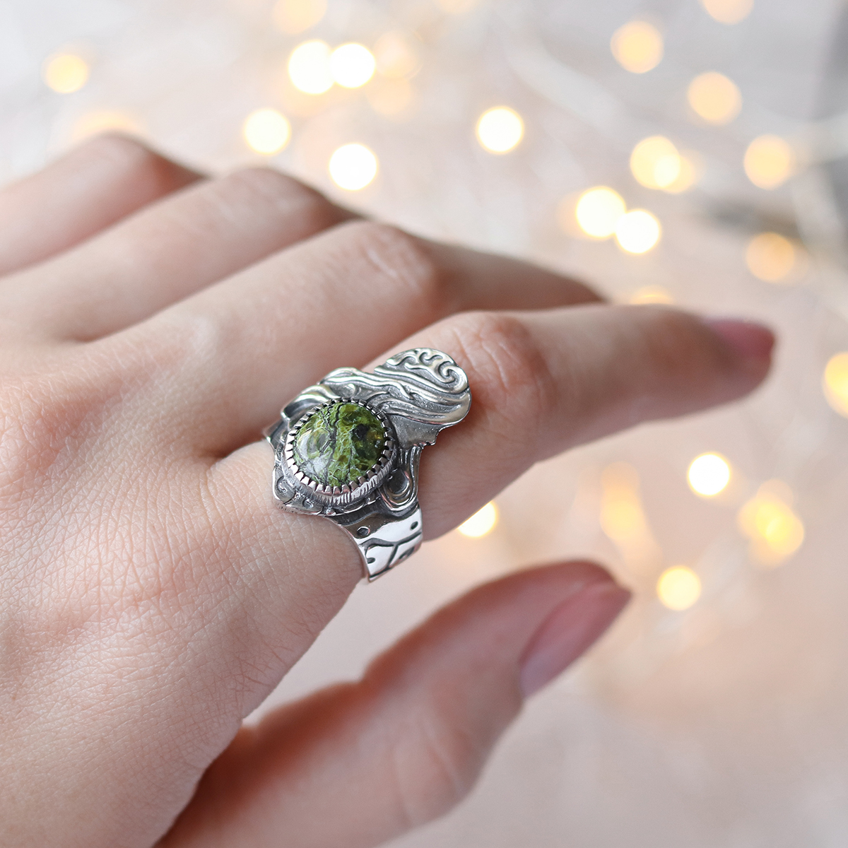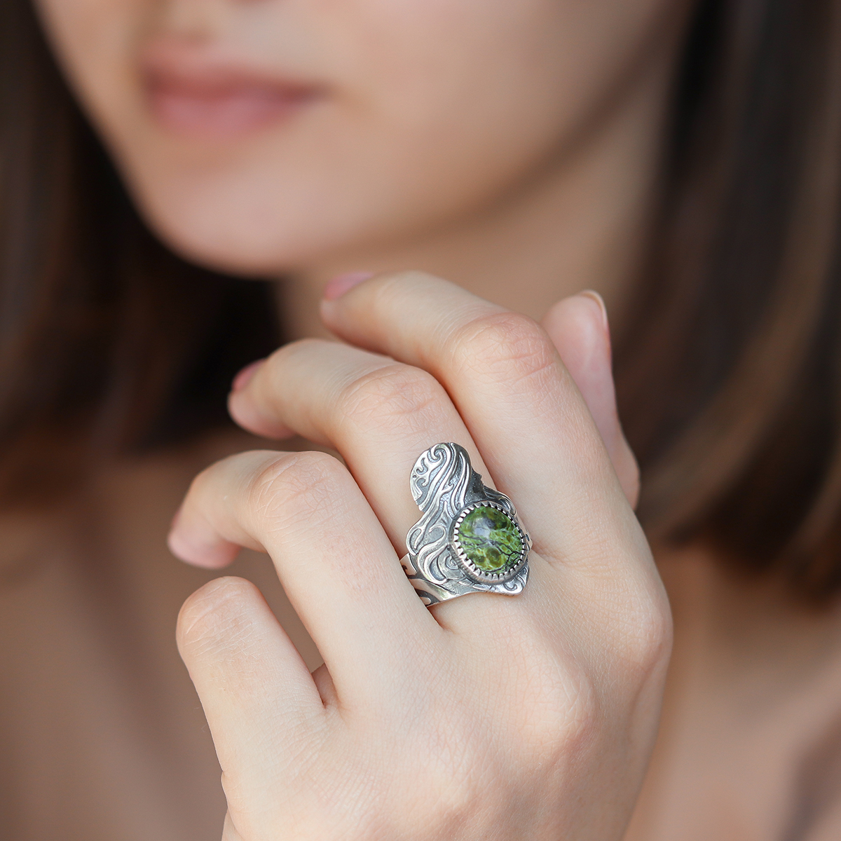 Габаритні розміри каблучки: довжина по пальцю – 24 мм; висота над пальцем – 6 мм.